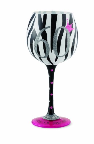 Mud Pie 60 Hand Painted Wine Glass Hand painted 16-ounce wine glass comes in an acetate box for easy gift-giving. With colorful black and white zebra striped design reads: "60" in glittery silver and "It's Not The Age, It's The Attitude!" around base and on packaging.